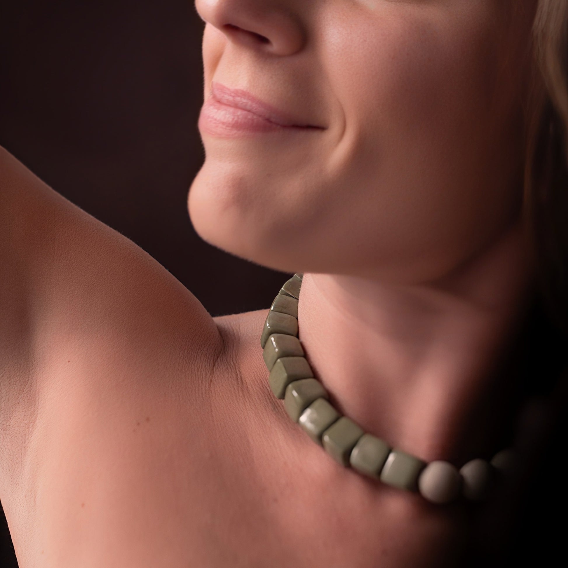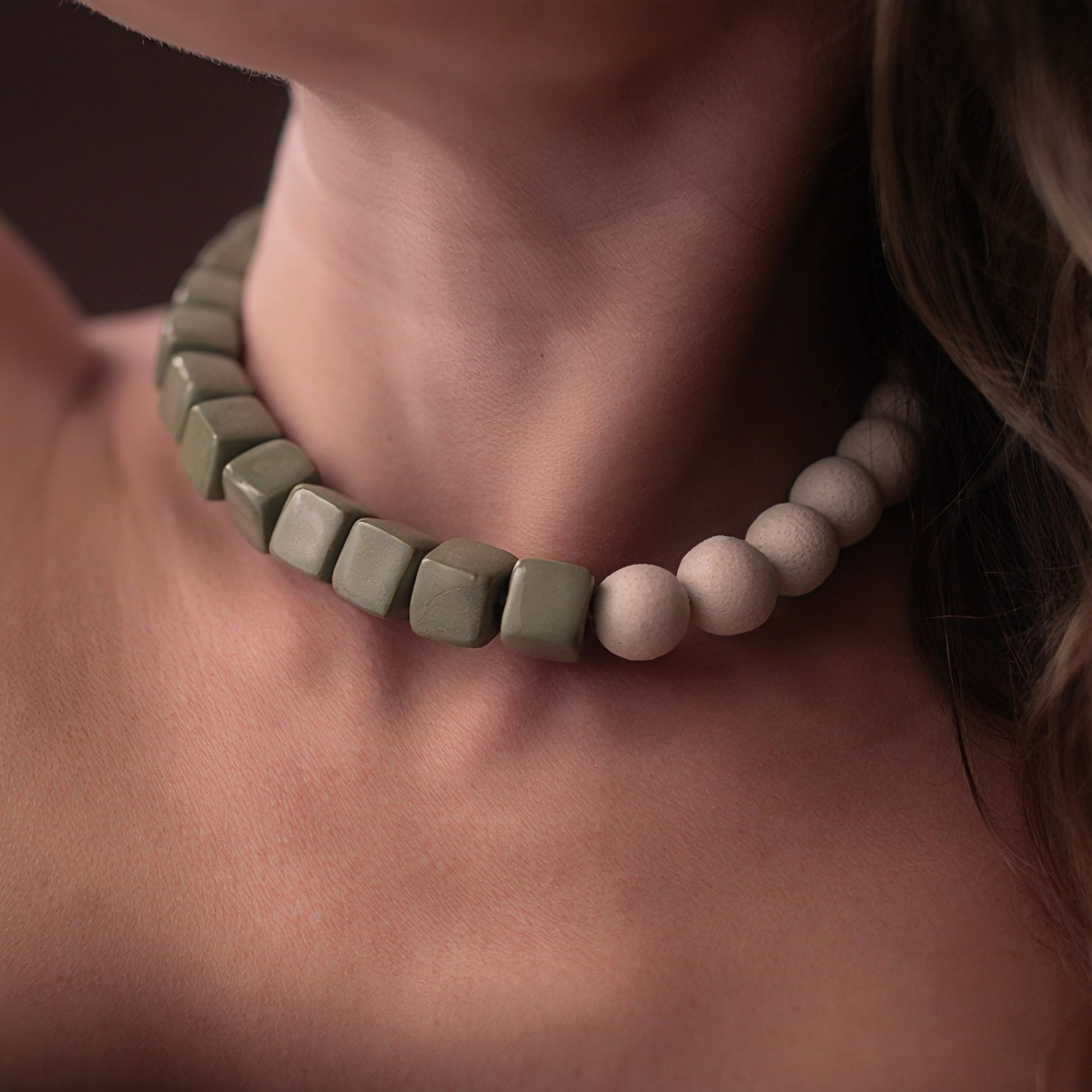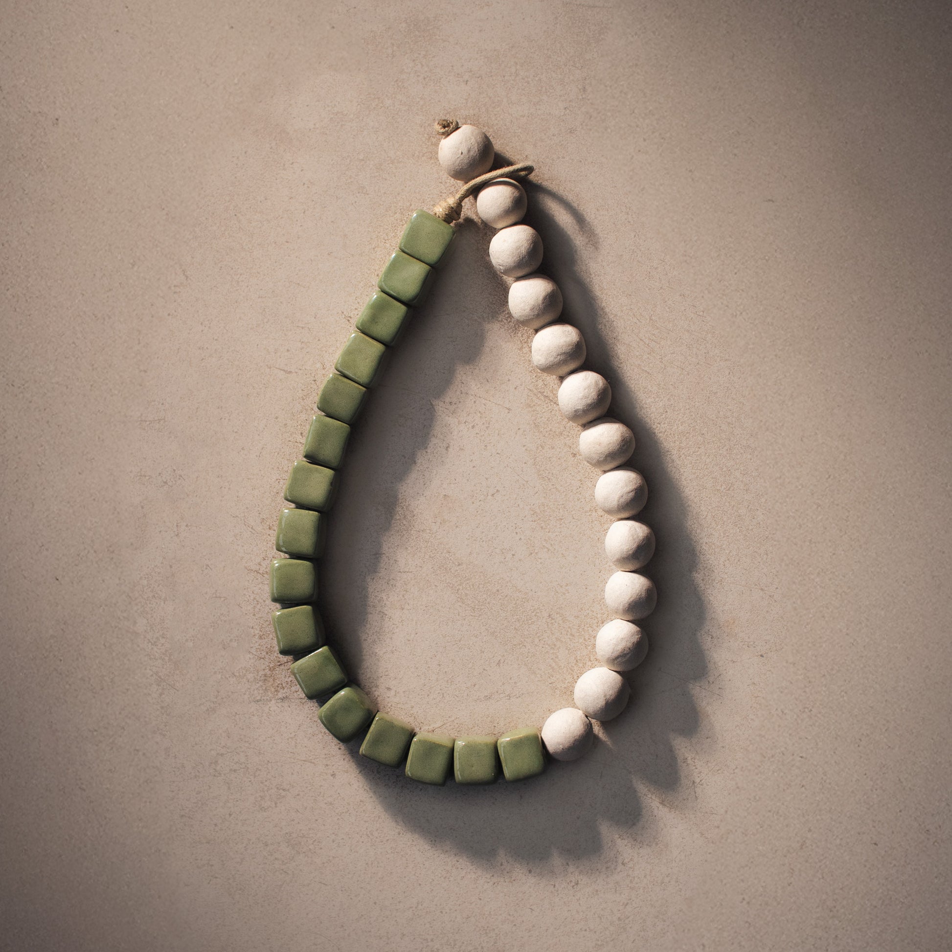 Colar de cerâmica, moldado à mão. Cada peça é única e carrega as marcas do trabalho artesanal — pequenas variações de cor, forma e textura. O acabamento é feito com fio de couro natural, que reforça a estética contemporânea e orgânica da coleção.