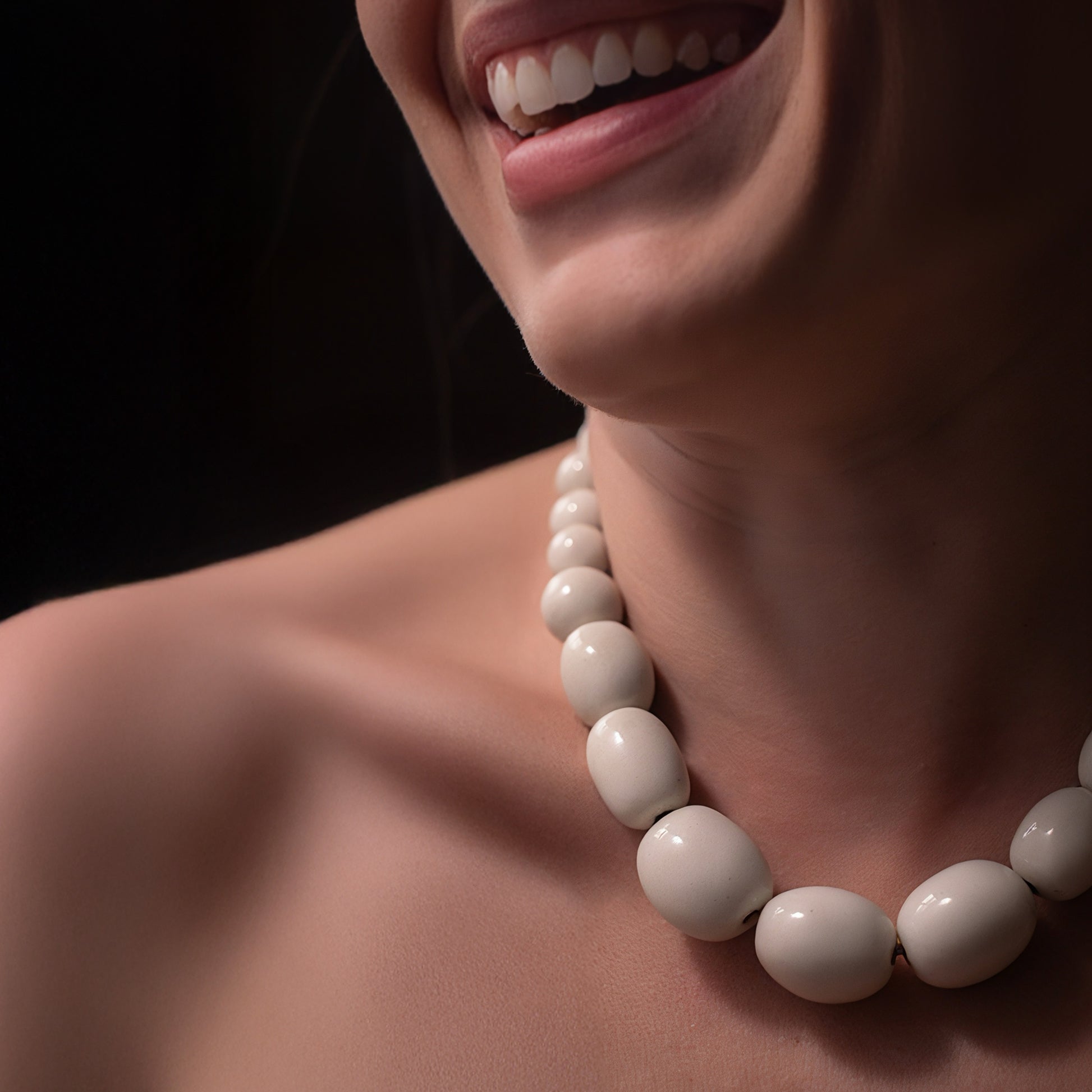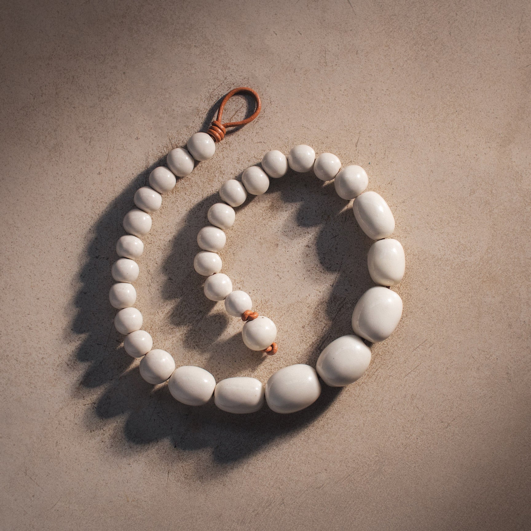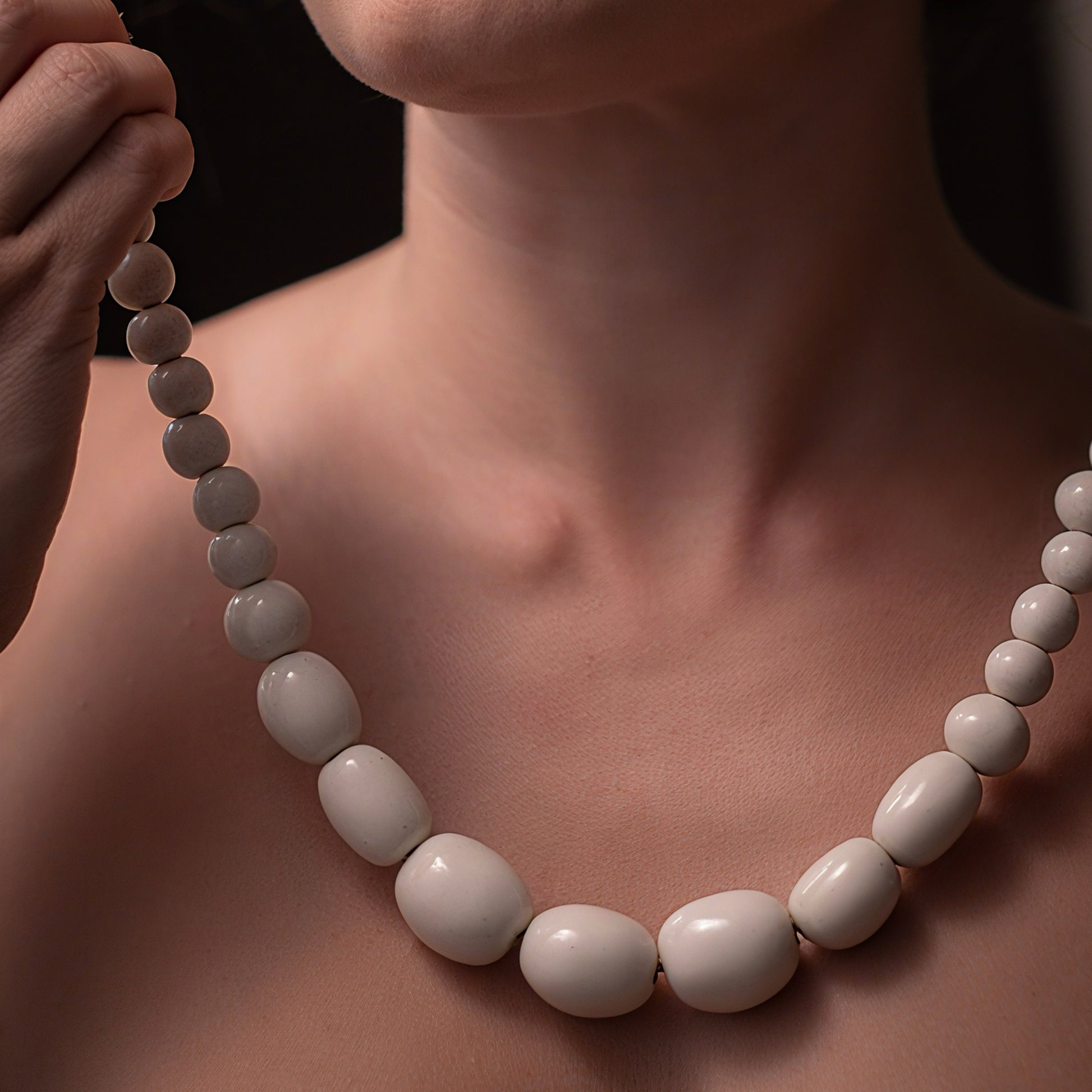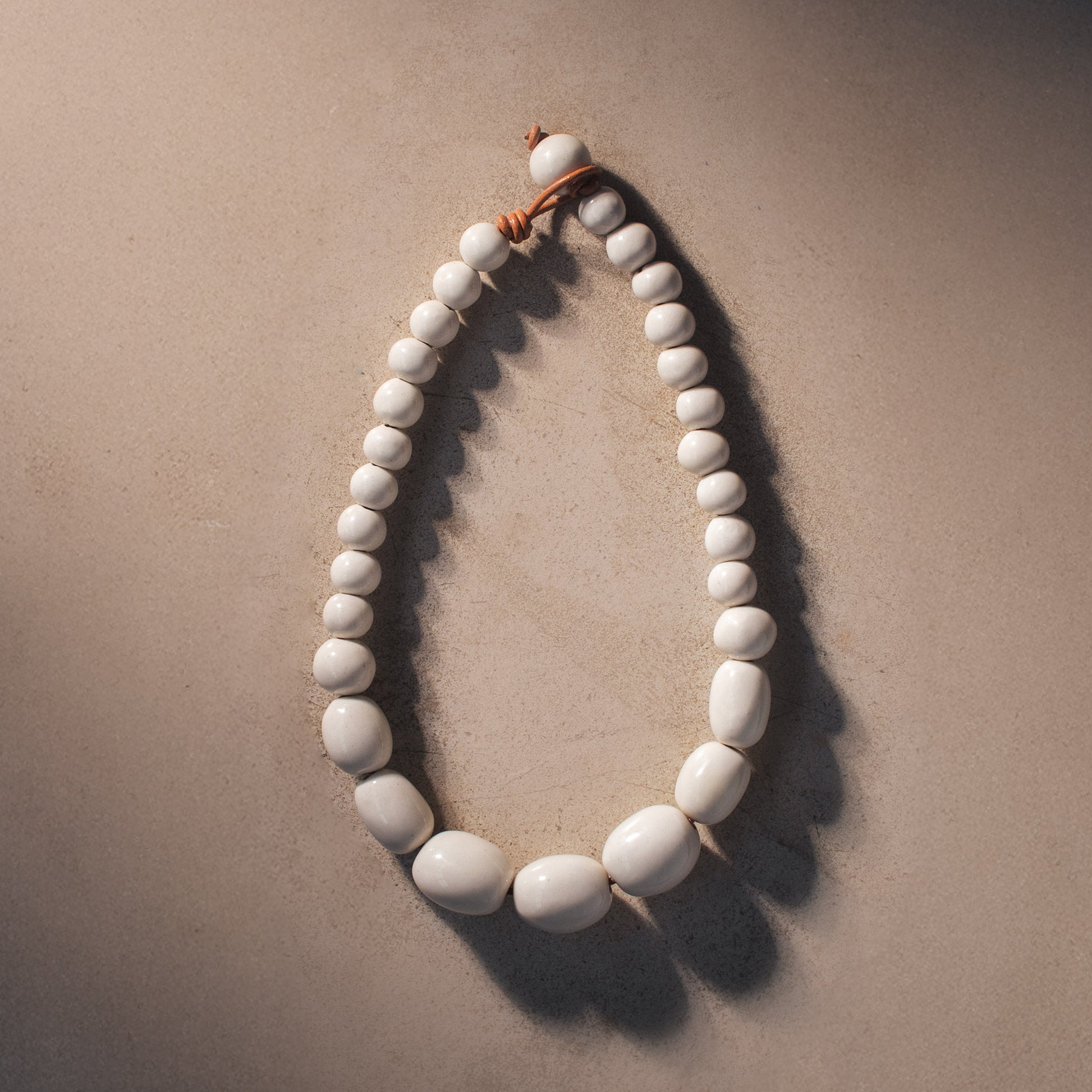Colar de porcelana, moldado à mão. Cada peça é única e carrega as marcas do trabalho artesanal — pequenas variações de cor, forma e textura. O acabamento é feito com fio de couro natural, que reforça a estética contemporânea e orgânica da coleção.