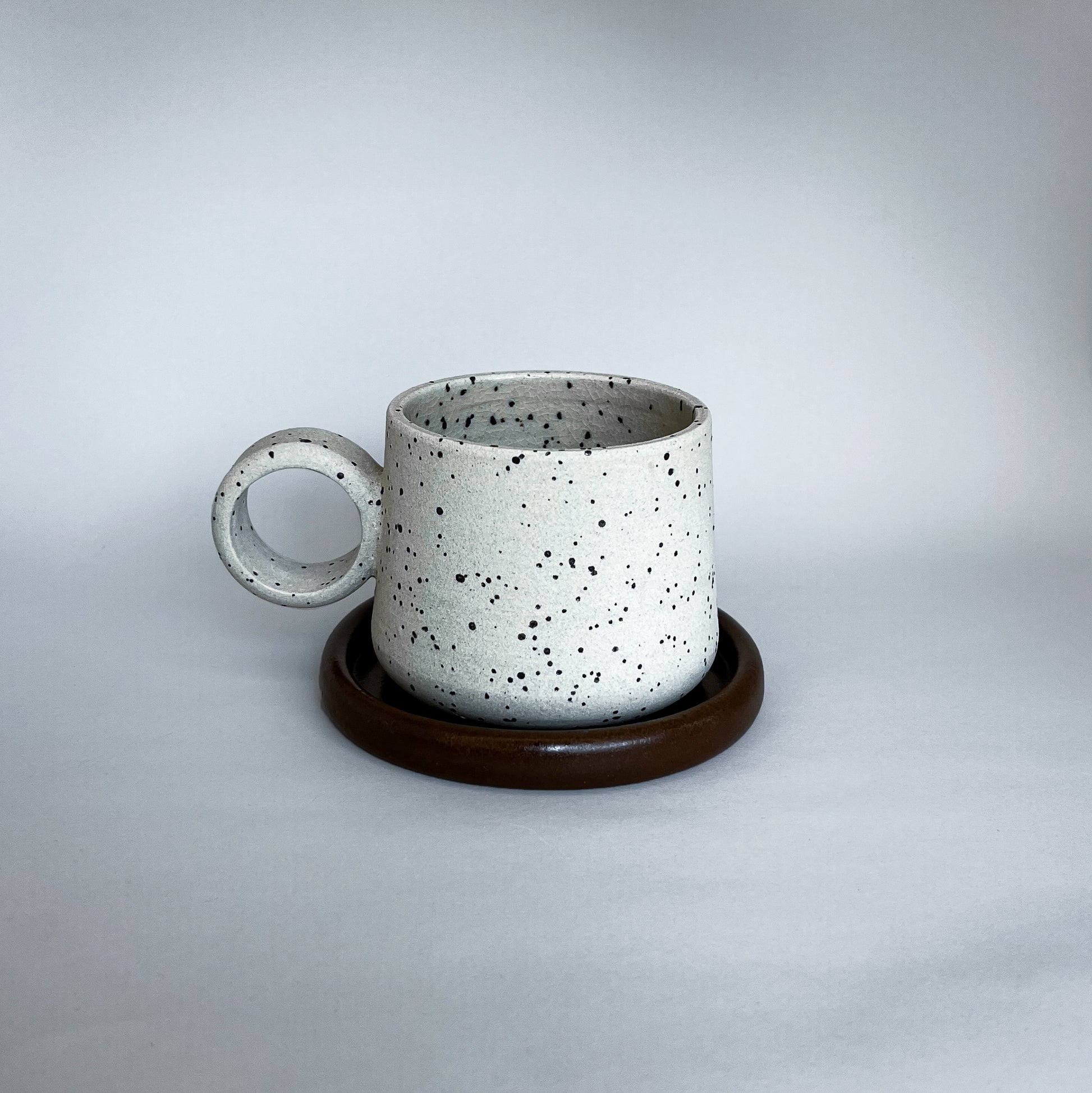 Feita para quem aprecia pausas breves, mas cheias de afeto. Essa versão traz a delicadeza da xícara Pontos — em branco com pintinhas escuras, leve e única como constelações desenhadas à mão — combinada com o pires Cacau, em marrom profundo e aveludado, que acolhe e intensifica o ritual.